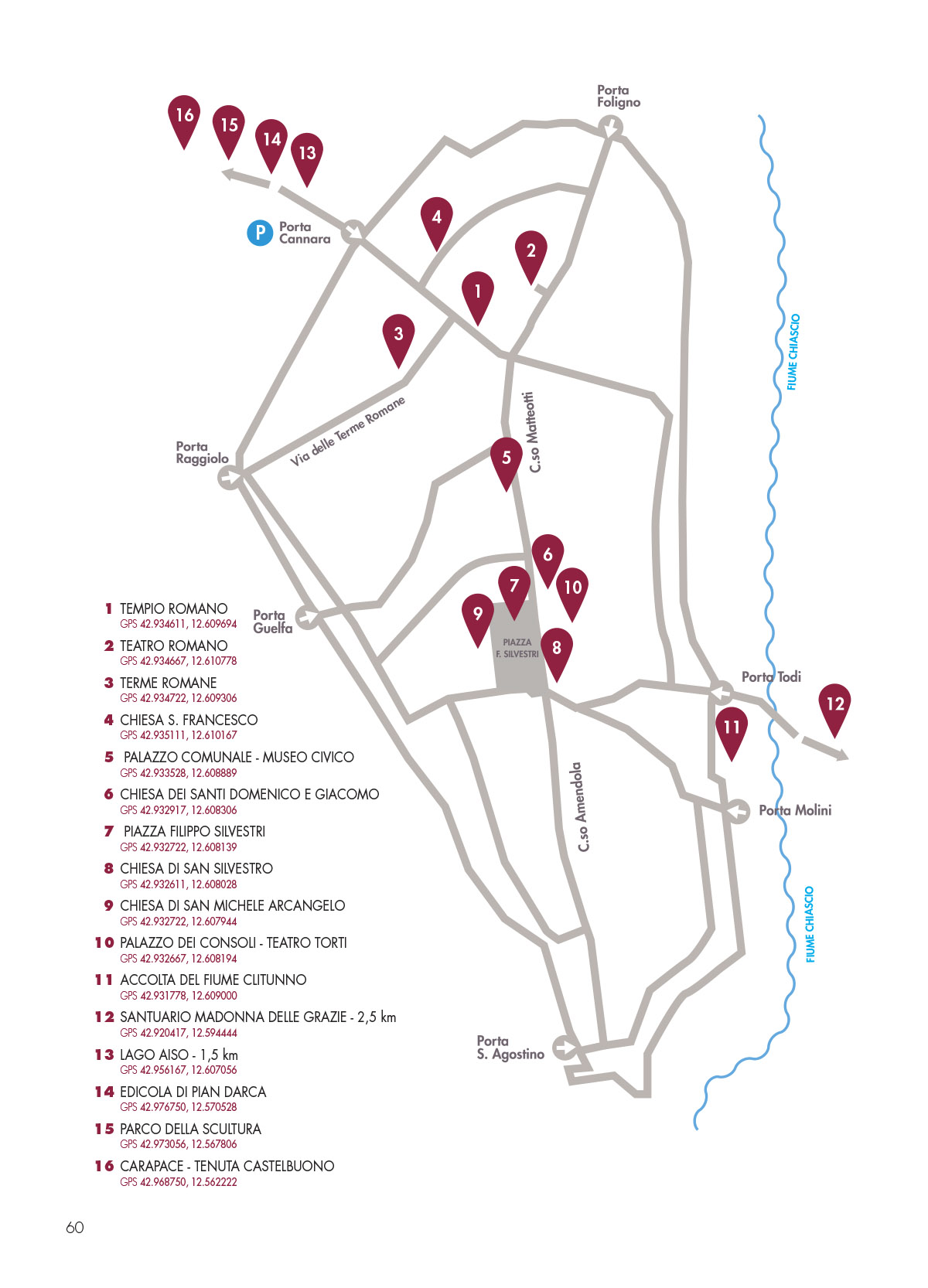Da Montefalco, Bevagna si raggiunge attraverso la suggestiva strada che da Monte Pennino si snoda tra i colli vitati. Conserva tuttora assai fedelmente l’assetto urbanistico del periodo romano, e costituisce un gioiello tra i piccoli borghi umbri tutto da scoprire, passeggiando con calma e godendo di angoli e scorci che sembrano proiettati in un Medioevo miracolosamente vivo.