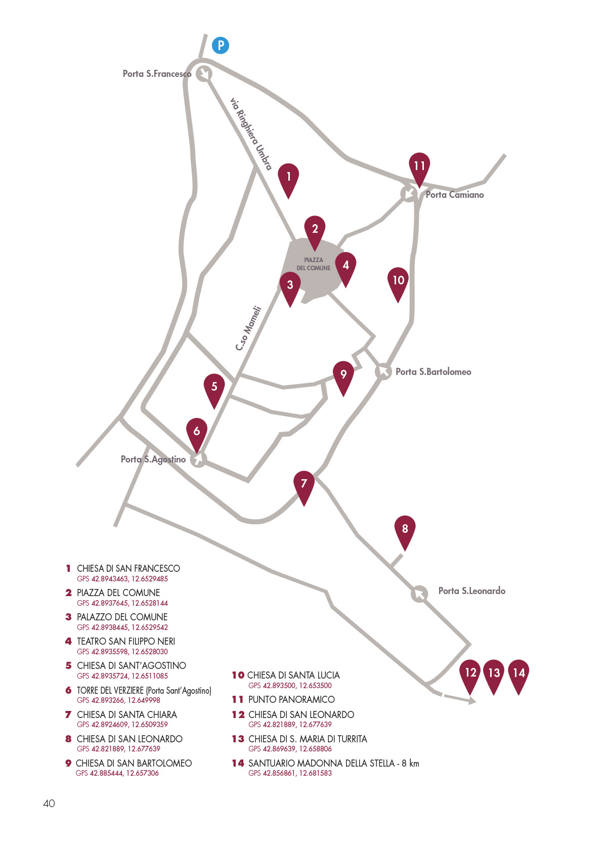 L’itinerario inizia da Castel Ritaldi, ove posizione e condizioni climatiche favoriscono la coltivazione della vite. All’interno delle mura, risalenti al XIII secolo, merita una visita la chiesa di Santa Marina (sec. XIV-XV).